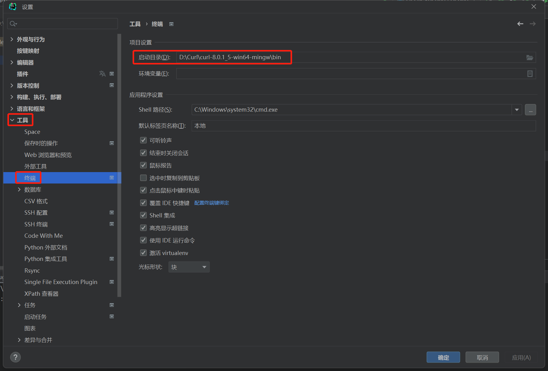 打开File -> settings -> Tools -> Terminal ,在启动目录里添加cURL的bin文件路径。