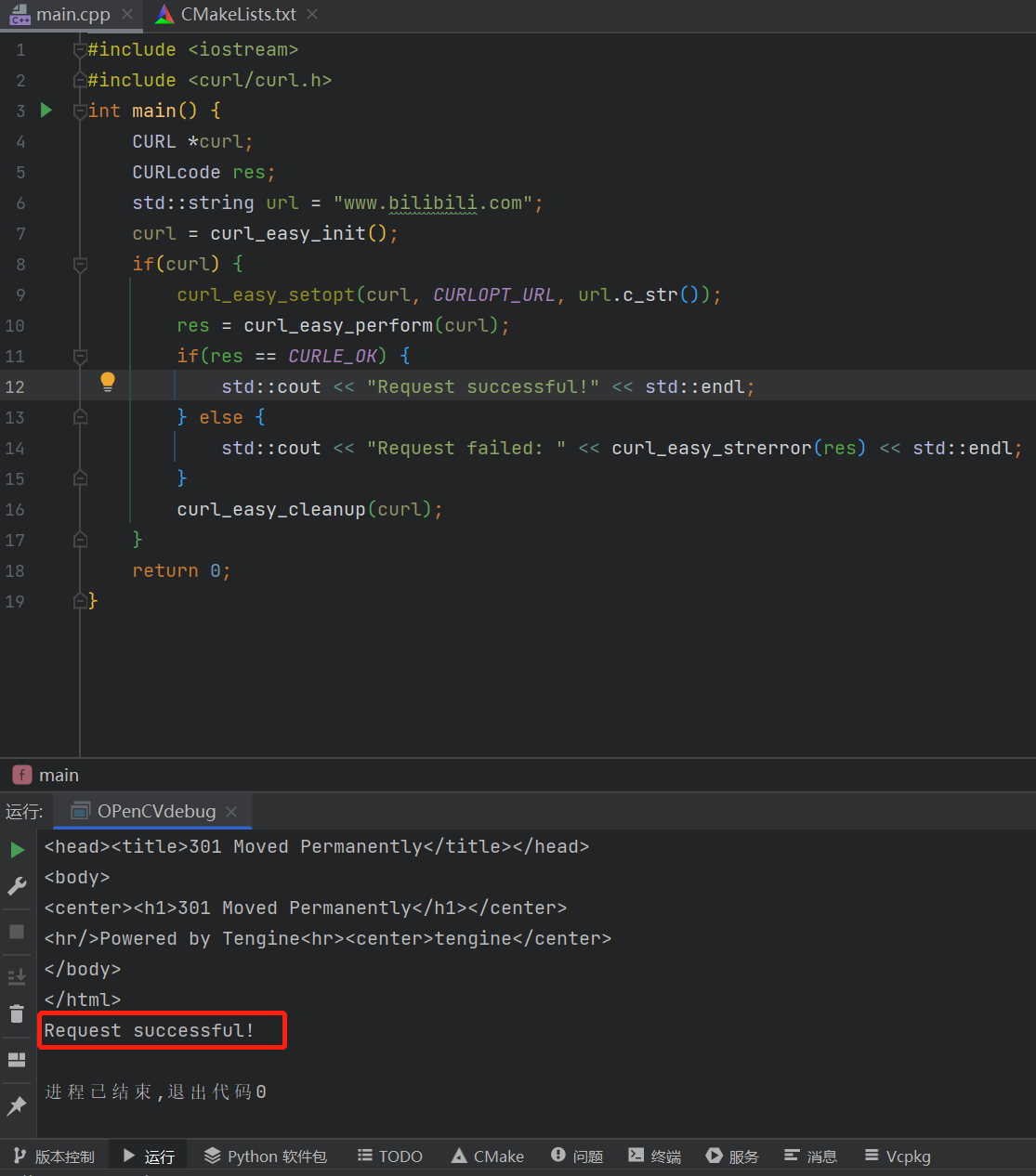 如果curl库成功配置,则运行上述程序将于最后一行输出Request successful!,否则未成功配置。